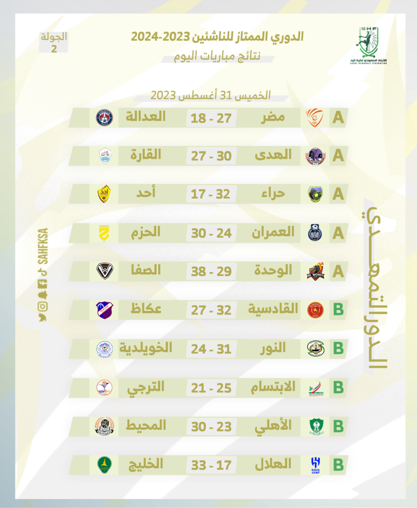 اختتمت اليوم الخميس 31 أغسطس 2023م، مباريات الجولة الثانية من بطولة الدوري الممتاز لكرة اليد لدرجة الناشئين للموسم الرياضي 2023-2024م، والتي واصلت فيه فرق: (الصفا – الحزم – مضر – الهدى – النور – الخليج – المحيط – الابتسام) تحقيق العلامة الكاملة برصيد 4 نقاط.