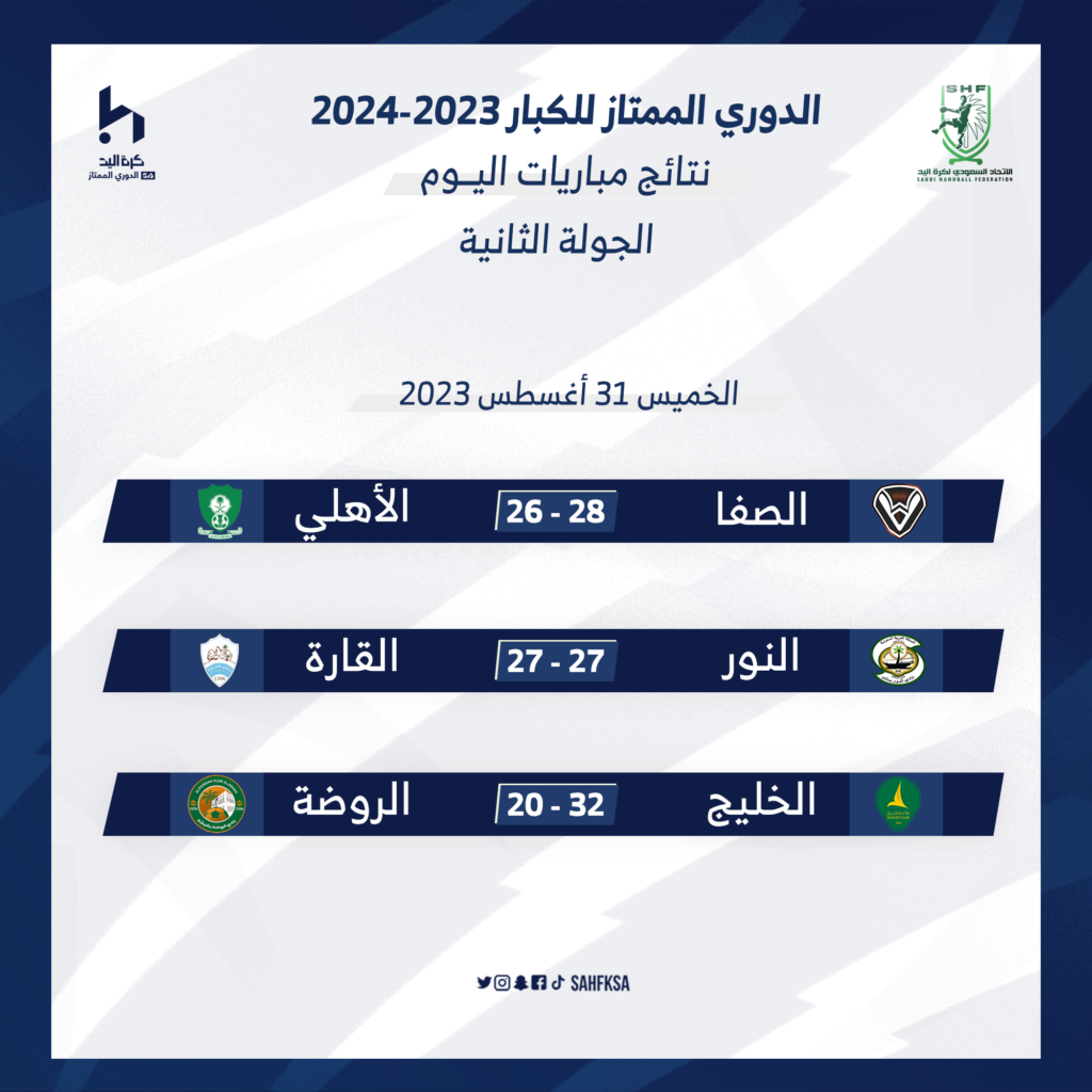 تمكن فريقا الخليج والصفا من تحقيق فوزهم الثاني على التوالي، ومواصلة حصد العلامة الكاملة بـ 4 نقاط لكلً منهما، في انطلاق مباريات الجولة الثانية من بطولة الدوري الممتاز لكرة اليد للموسم الرياضي 2023-2024م، والتي شهدت إقامة ثلات مباريات مساء اليوم الخميس 31 أغسطس 2023م.