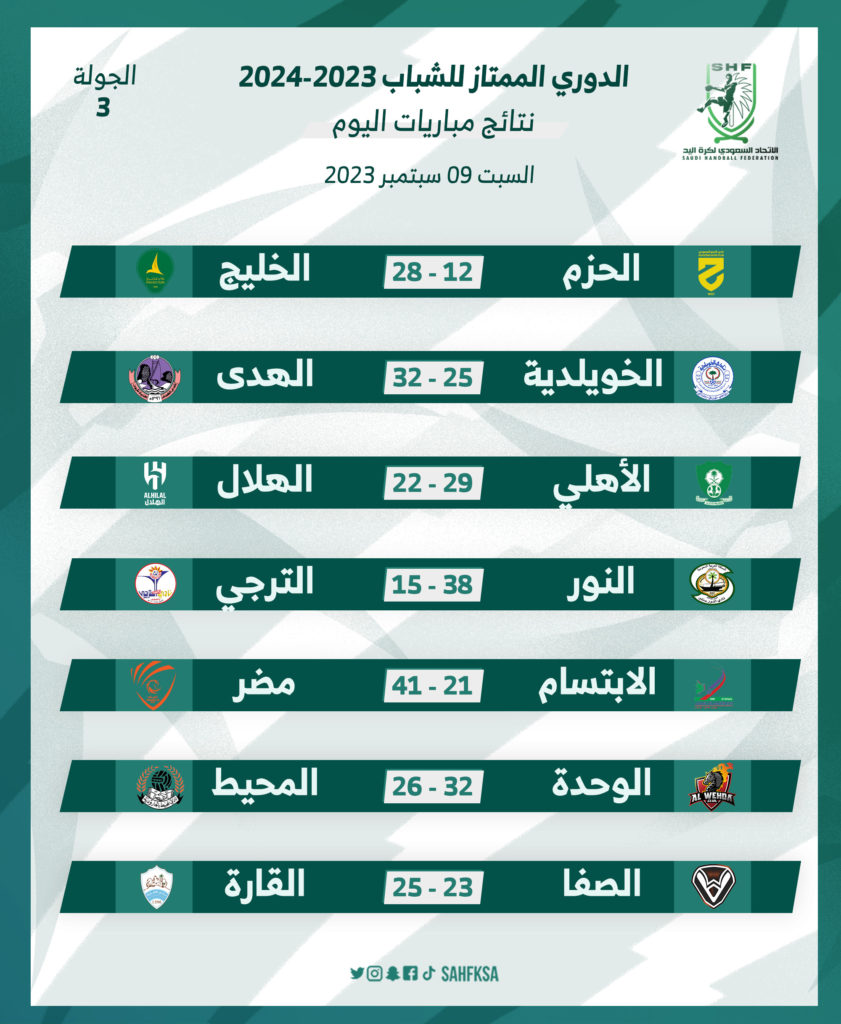 واصلت أندية النور والخليج ومضر والوحدة حصدها للعلامة الكاملة بعد أن رفعت رصيدها إلى 6 نقاط، إثر فوزها ضمن الجولة الثالثة من منافسات بطولة الدوري السعودي الممتاز لكرة اليد لدرجة الشباب للموسم الرياضي 2023-2024م، والتي جرت اليوم السبت 09 سبتمبر 2023م.
